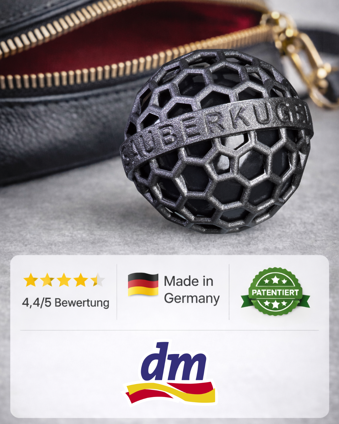 „Der tägl. Begleiter meiner Handtasche. Während ich sie durch die Gegend trage, wird meine Tasche sauber. Die Sauberkugel darf nicht mehr fehlen, ob im Alltag oder auf Reisen.“